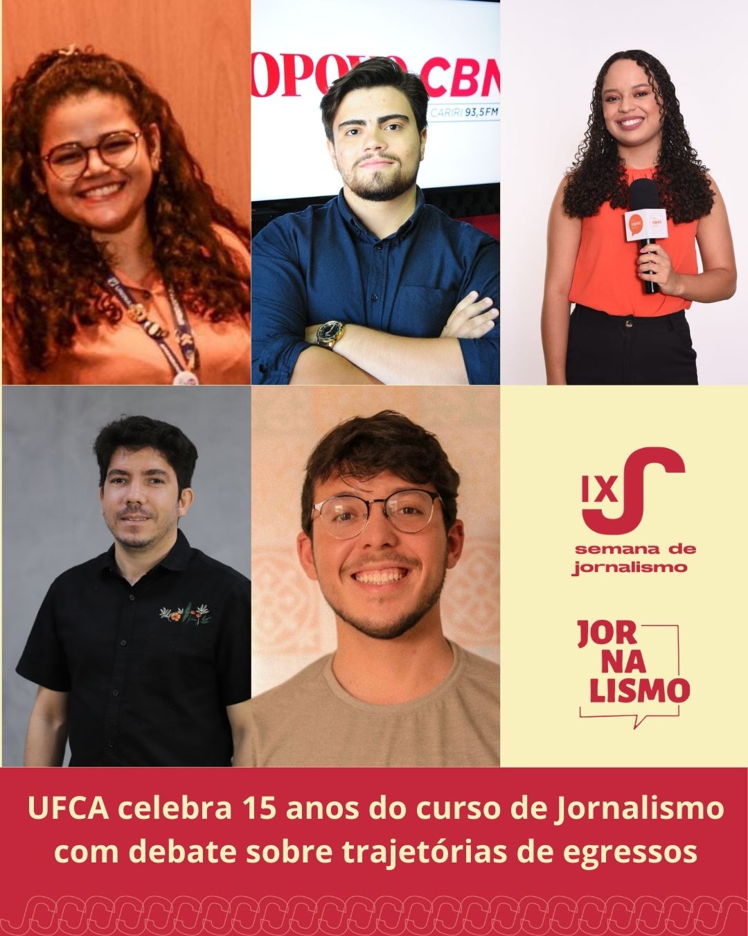 O curso de Jornalismo da Universidade Federal do Cariri (UFCA) completa 15 anos de atividades em 2025. Para celebrar a data, será realizada uma mesa-redonda na próxima quinta-feira, 11 de setembro, às 18h30, no auditório da ADUFC, a Associação dos Docentes das Universidades Federais do Ceará. Intitulada “15 anos de jornalismo na UFCA: Caminhos que vieram depois”, a atividade reunirá egressos que hoje atuam na comunicação regional, em uma conversa sobre o impacto da formação acadêmica em suas trajetórias profissionais.