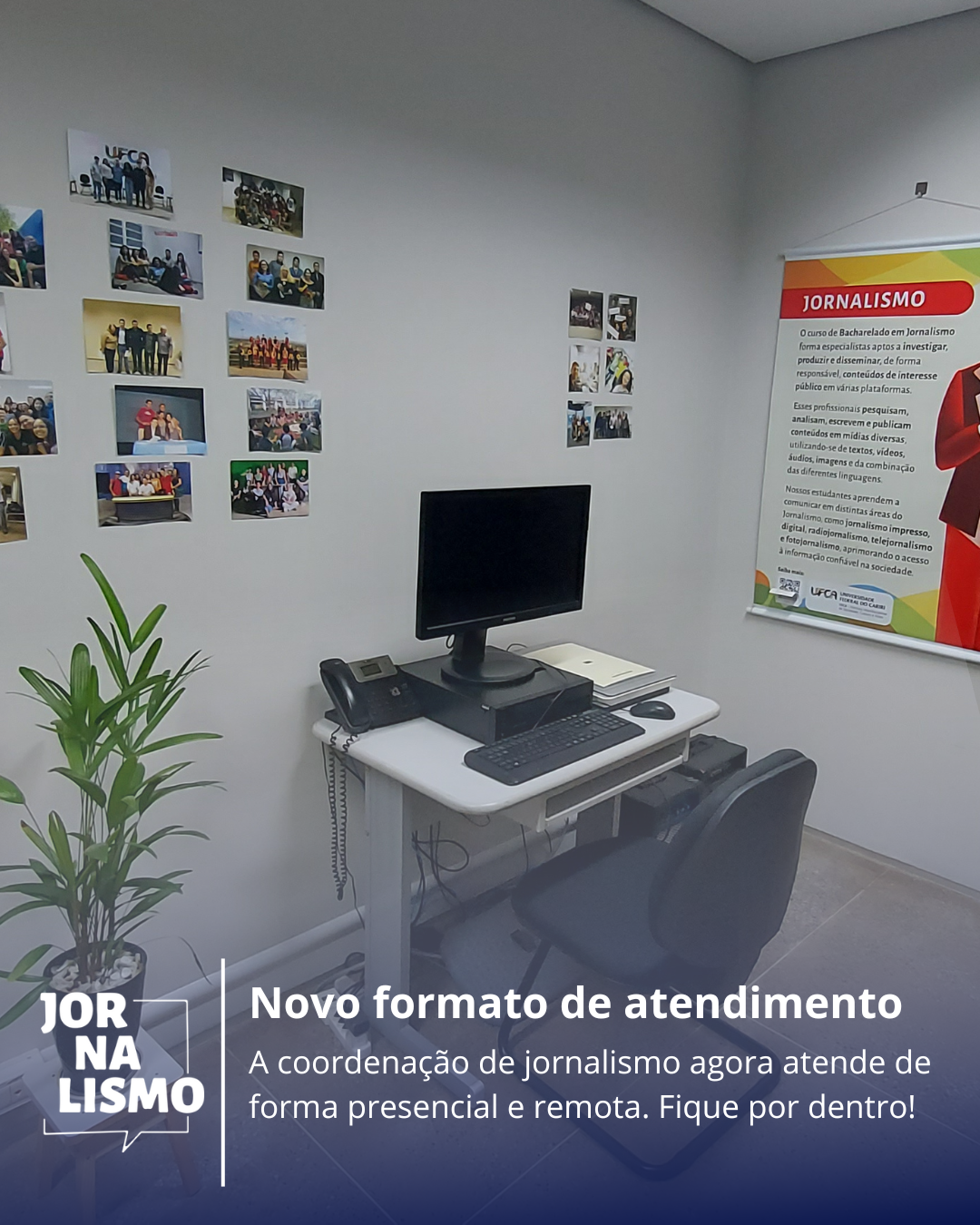 A partir desta terça-feira, 08 de outubro, a Coordenação do curso de Jornalismo passou a funcionar em novo formato de atendimento. A mudança ocorre em virtude da adesão da assistente do curso, Jéssica, ao Programa de Gestão de Desempenho (PGD), que permite a realização de atividades em regime de trabalho remoto em determinados dias da semana.