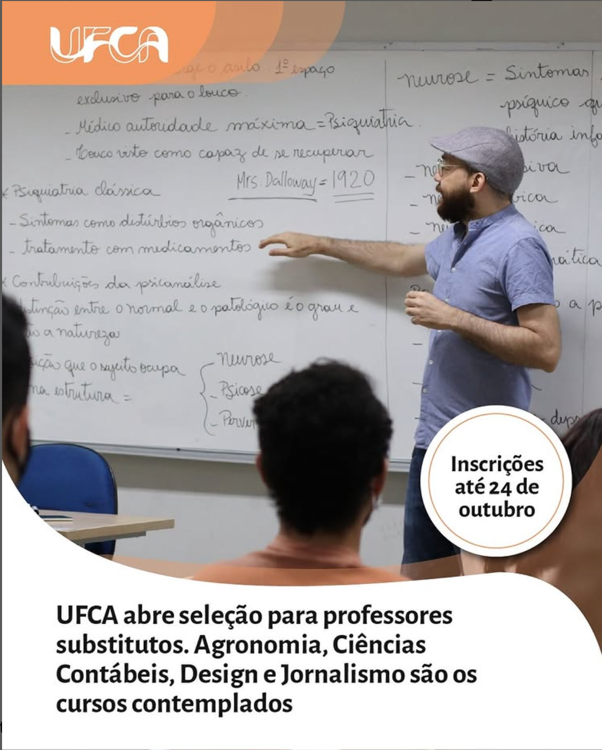A Universidade Federal do Cariri (UFCA) está com inscrições abertas para professores substitutos, conforme o Edital nº 31/2025, publicado pela Pró-Reitoria de Gestão de Pessoas (Progep). No curso de Jornalismo, a vaga é para Comunicação e Cultura.