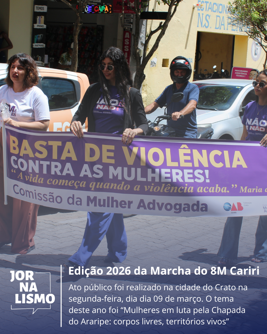 A edição 2026 da Marcha do 8M Cariri foi realizado na segunda-feira, dia dia 09 de março, com o tema “Mulheres em luta pela Chapada do Araripe: corpos livres, territórios vivos”. A mobilização reuniu grupos e organizações apoiadoras em defesa dos direitos, vidas e territórios.  Organizada pelo Movimento 8M Cariri, a Frente de Mulheres do Cariri e pelo Conselho Municipal dos Direitos da Mulher Cratense em alusão ao Dia Internacional da Mulher, o ato público destacou a relação entre a luta feminista e a defesa ambiental, reforçando a importância da preservação da Chapada do Araripe.